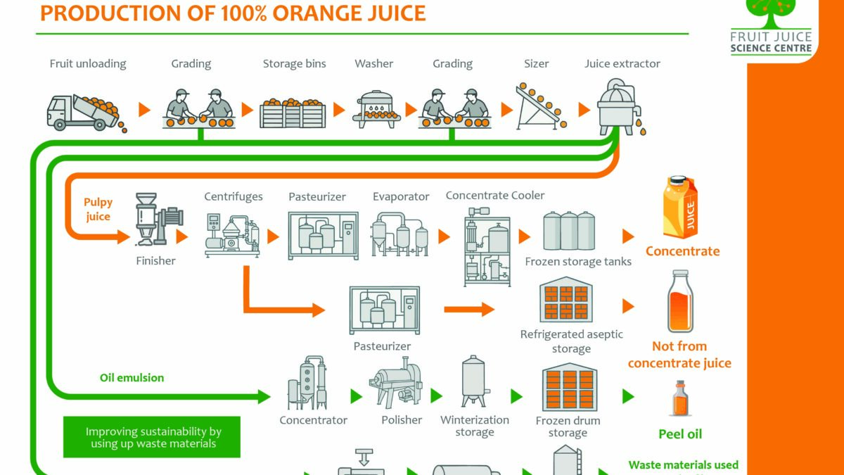 La última infografía de Fruit Juice Science Centre muestra cuán sostenible es toda la cadena de producción del zumo de naranja: incluso las semillas, las fibras blancas y la pulpa se aprovechan para elaborar pectina, un ingrediente rico en fibra, así como aceite esencial de naranja y alimento para animales.