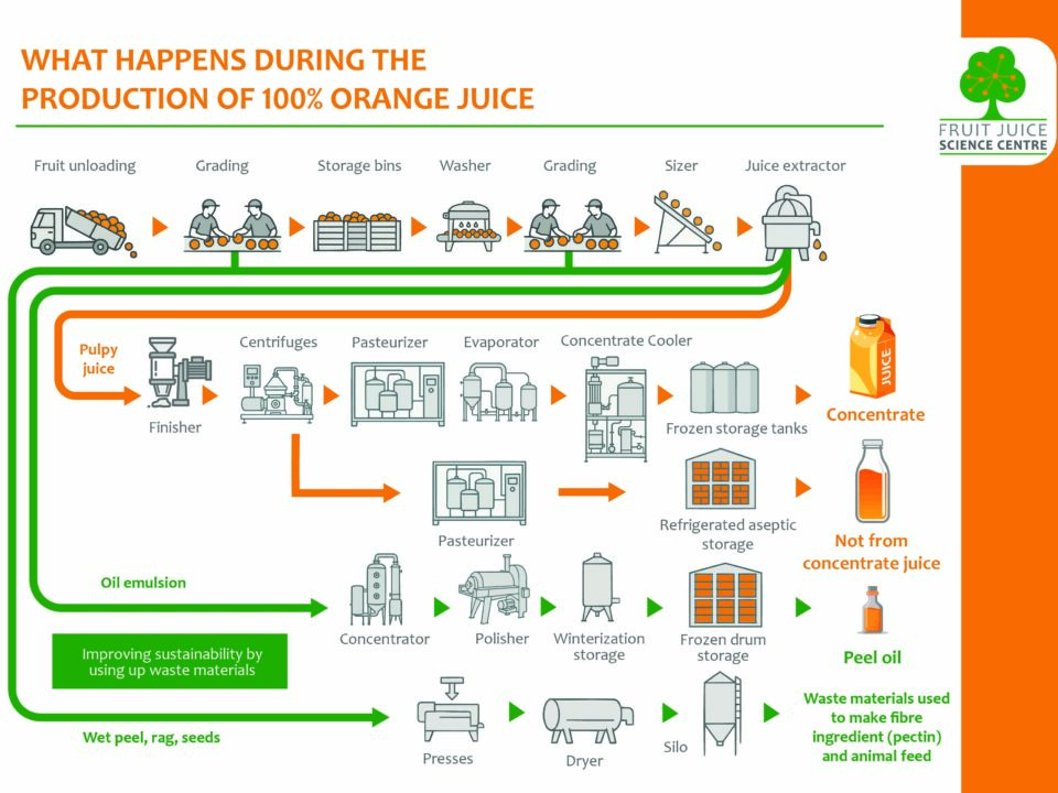 We squeeze oranges and mandarins to obtain juice not from concentrate, which is pasteurized and stored aseptically under refrigeration conditions.
